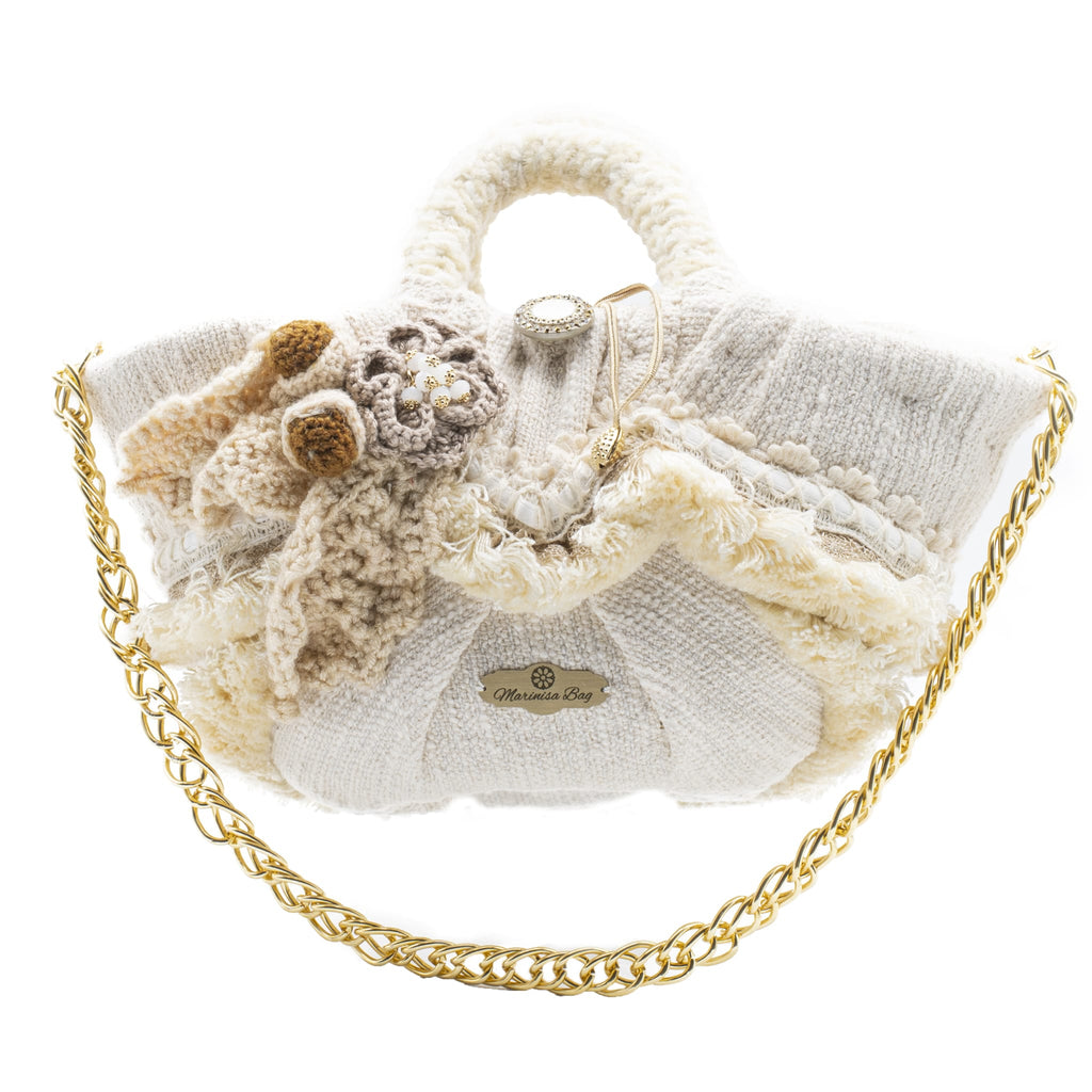 Coffa in palma nana intrecciata, completamente rivestita in tessuto avorio. La parte frontale è impreziosita da fiori, foglie e ghiande in lana, lavorate a mano, dai colori delle tonalità dell'avorio. Tutta la coffa è circondata da un decoro di passamanerie che ne accrescono l'eleganza e la bellezza. Rivestimento interno, chiusura con sacca e bottone abbinato. Tracolla con catena oro removibile.