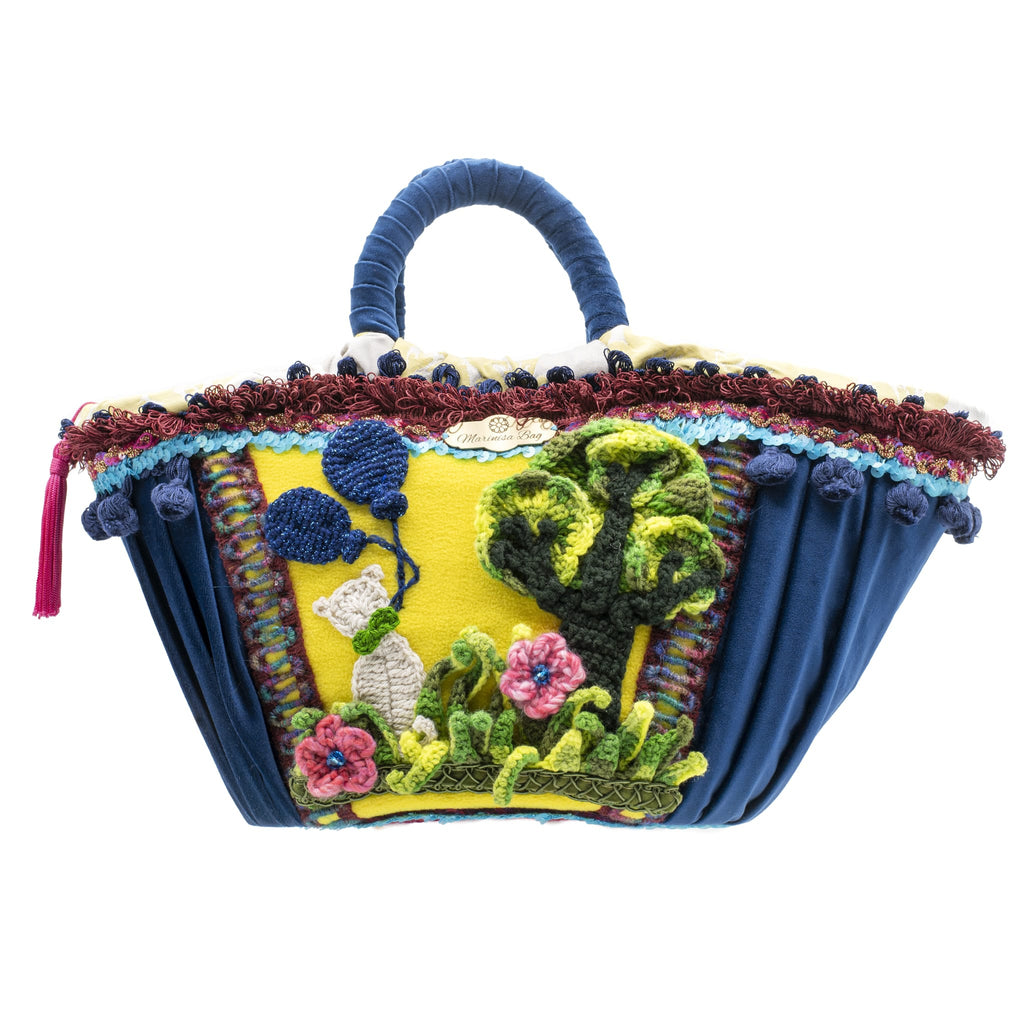 Coffa in palma nana intrecciata, completamente rivestita in tessuto. Nella parte posteriore e frontale è stato inserito un tessuto giallo circondato da passamanerie di diverse tipologie per forma e colore. Nei due lati della coffa è stato inserito un gioco di pieghe di velluto blu, che evidenziano maggiormente la parte centrale ricca di inserti in lana lavorati a mano.Tutto ciò che è stato cucito in questa coffa è stato scelto con cura e rispetto negli abbinamenti dei colori. Rivestimento interno e chiusura con cerniera. Pochette compresa.