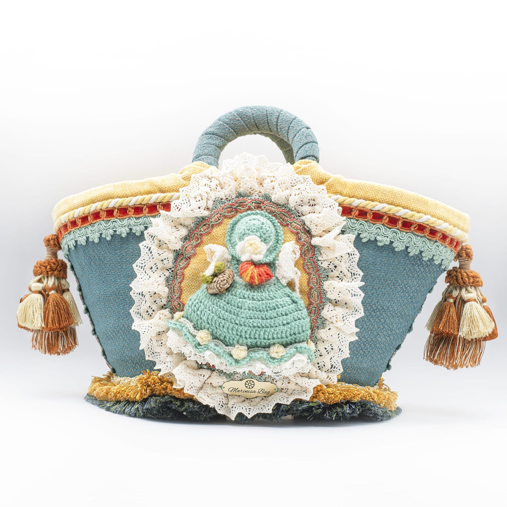 Coffa in palma nana intrecciata, completamente rivestita. Per tutta la coffa è stato scelto un tessuto verde petrolio, contornato da una ciniglia di colore giallo e passamanerie verde, arancione, avorio, marrone. Il tutto fa da decoro alla bambolina che è stata inserita al centro di una meravigliosa cornice di pizzo di ciniglia colore avorio.Nei due lati due nappine dai colori caldi accrescono la bellezza. Tutto l'interno è rivestito. Chiusura con cerniera e pochette compresa.