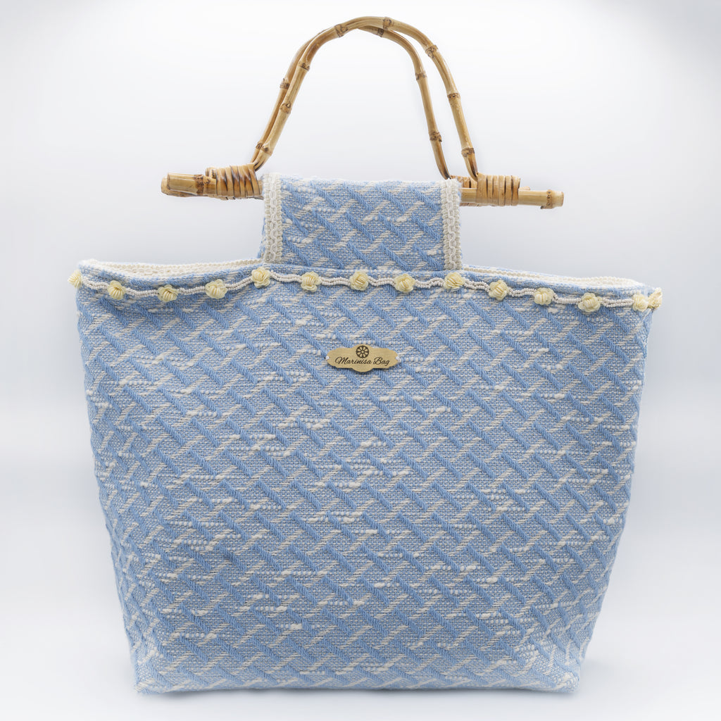 Borsa in tessuto a fantasia geometrica. Decorazione di fiori in strass nei bordi. Rivestimento interno monocolore. Manico in bambù.