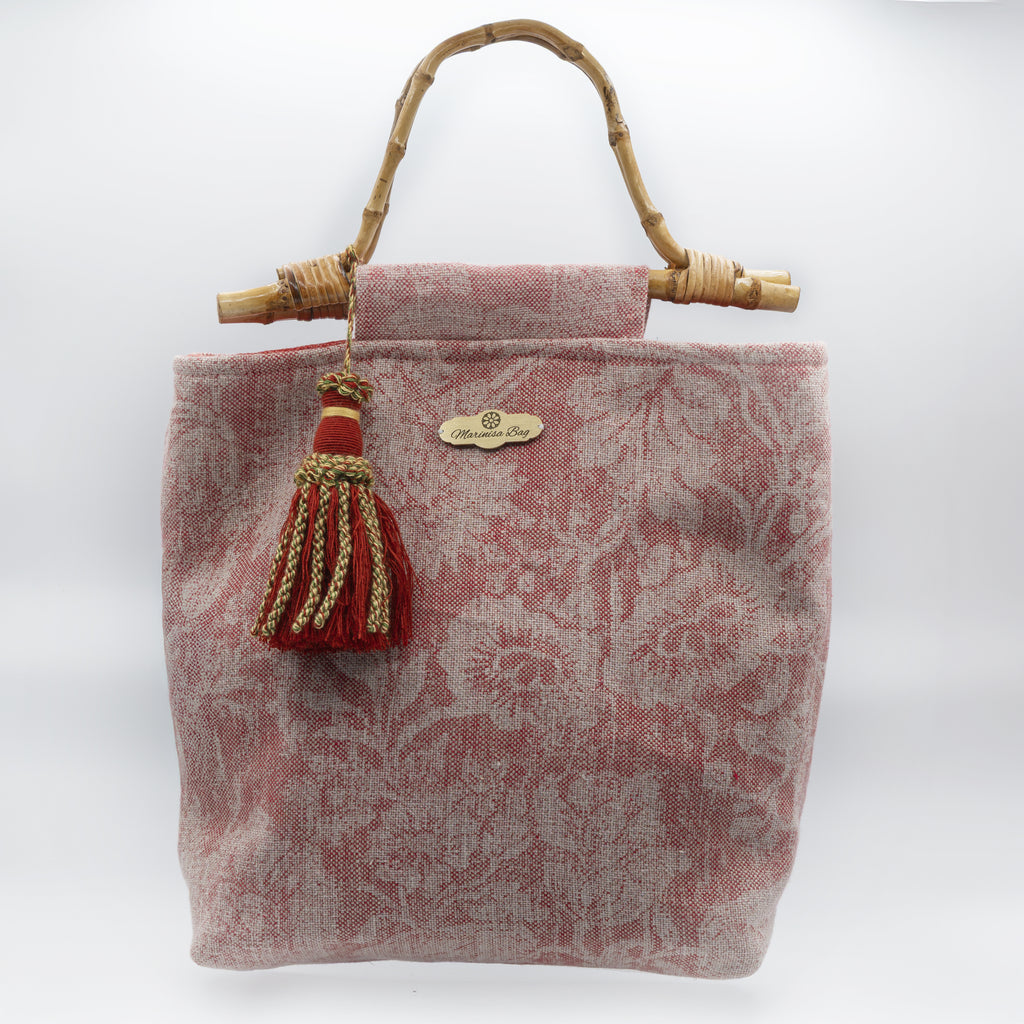 Borsa in tessuto floreale. Rivestimento interno monocolore. Manico in bambù con nappina abbinata.