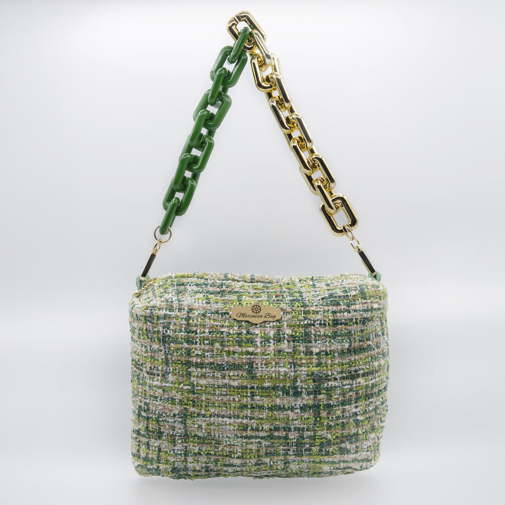 Borsa in tessuto tweed. Rivestimento interno monocolore. Tracolla corta e removibile bicolore.