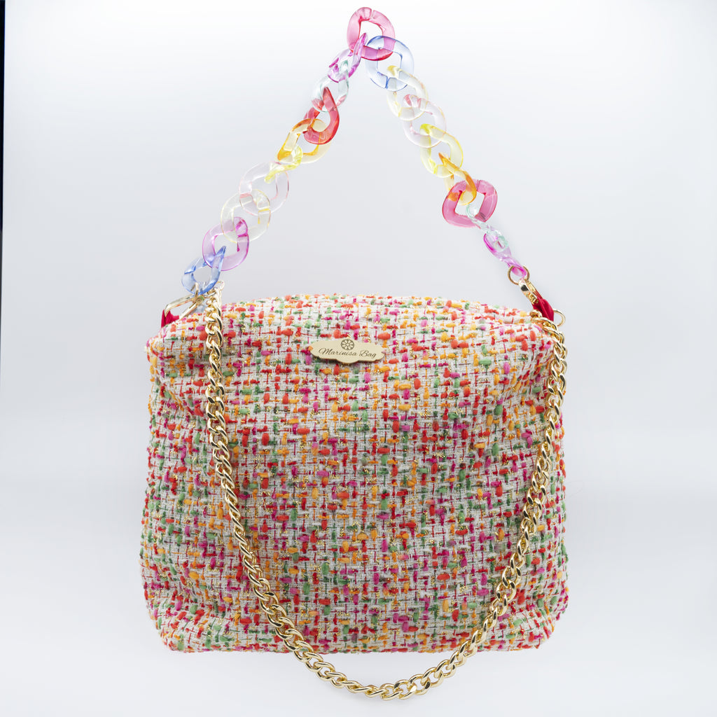 Borsa in tessuto tweed. Rivestimento interno monocolore.Tracolla lunga removibile oro. Catena colorata decorativa.