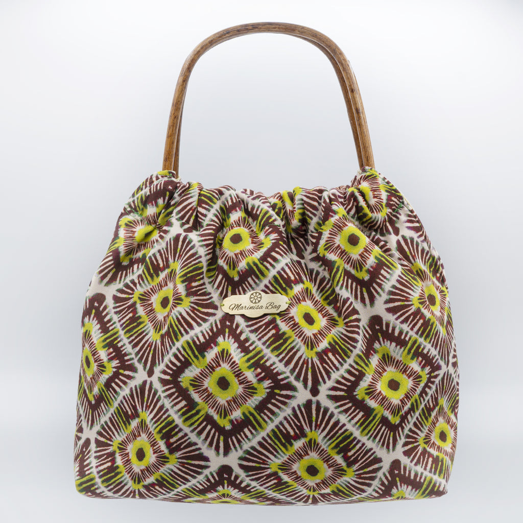 Borsa in tessuto a fantasia geometrica. Rivestimento interno monocolore. Manico in bambù.
