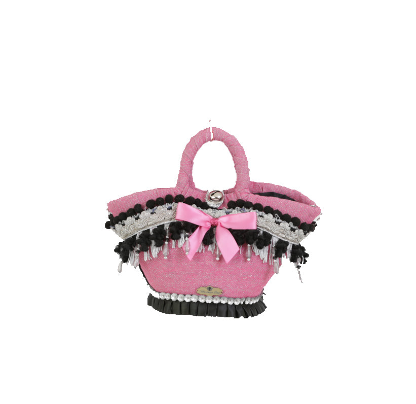 Coffa siciliana in palma nana intrecciata, rivestita esternamente in tessuto fucsia in lurex argento. La parte superiore è totalmente impreziosita da passamaneria argento, pendenti grigi, pon pon neri. Nella parte centrale un fiocco in raso fucsia dona uno stile romantico, particolare e appariscente. La parte inferiore è ornata da raso nero e fiorellini lucenti in strass. Chiusura con "ciancianeddu" siciliano e sacca interna completa di tasca ornata con le medesime passamanerie della coffa. Tracolla a catena argento rimovibile.