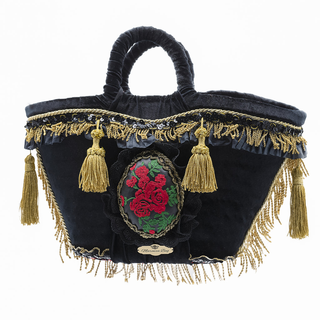 Coffa in palma nana intrecciata completamente rivestita in ciniglia ed ecopelle nera. La base esterna è impreziosita da un tessuto rosso, con decori damascati neri in rilievo . La parte frontale è adornata da un rosone di rose rosse , circondato da passamanerie oro e pizzo nero . Un susseguirsi di frange oro attraversano tutta la coffa , dove sul retro creano un decoro armonioso ed elegante, che fanno da cornice al mazzo di rose . Il manico è tutto rivestito , inoltre nella parte posteriore è impreziosito da due leoni in ottone con nappine rosse , che insieme alle due trinacrie posizionate nei due lati, ne accrescono la sicilianità .La coffa è curata nei dettagli in entrambi i lati, così da scegliere quale parte sfoggiare. La parte interna è rivestita e comprende una tasca. Pochette abbinata da poter utilizzare anche separatamente.