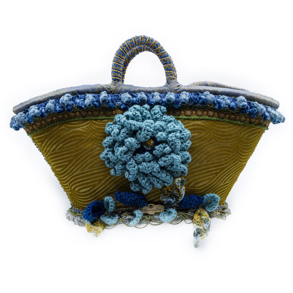 Coffa in palma nana intrecciata, completamente rivestita in velluto decorato.La parte superiore è arricchita da passamanerie dai toni del celeste, dell'azzurro e del marrone. Nella parte centrale un fiore di lana lavorato a mano, ne accresce l'imponenza. La parte inferiore oltre le passamanerie, racchiude un insieme di foglie di lana dai medesimi colori, che ne esaltano la bellezza.Il manico e l'interno sono completamente rivestiti.Chiusura con cerniera.Pochette abbinata compresa.