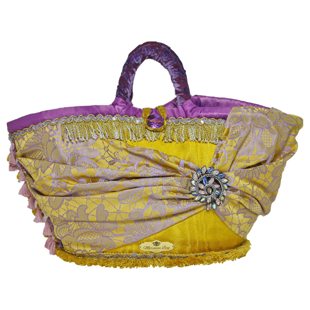Coffa siciliana in palma nana intrecciata, completamente rivestita da tessuto oro. Davanti drappeggio con tessuto fantasia floreale viola, il nodo è impreziosito da una girandola di cristalli lilla-argento. I due lati esterni alla coffa sono ornati con passamanerie differenti ma che adornano al meglio la coffa.La parte frontale è abbellita da una doppia frangia oro-argento. Il manico è rivestito con velluto floreale viola. Chiusura sia con bottone, sia con sacca interna, quest’ultima compresa di tasca, impreziosita da passamanerie che ne evidenziano la bellezza. Pochette interna in tessuto oro impreziosita da passamanerie e strass medesimi alla coffa.