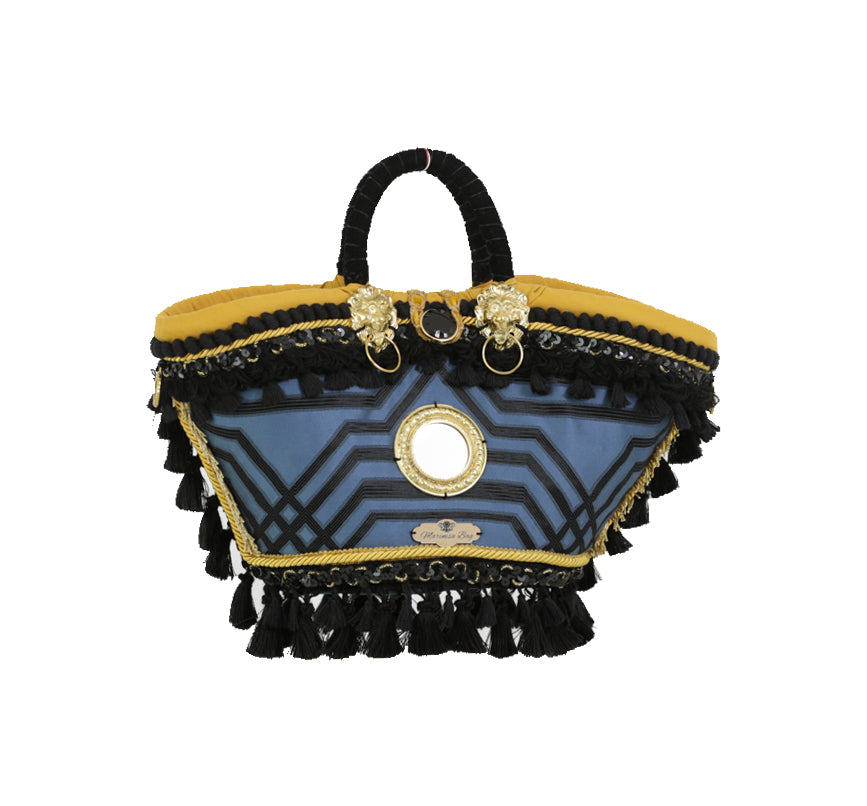 Sicilian crow's nest in woven dwarf palm, externally covered in blue shaved cotton, with black geometric decorations, all framed by gold shaved cord, black trimmings of various sizes which increase its particularity. The brightness of the black rhinestones, the gold of the flashy golden brass lions, the end of the handle, the central button and the wonderful central mirror typical of Sicilian folklore highlight the uniqueness of the details, cared for, studied and chosen with chromatic harmony. The closure is either with a button or with a golden yellow pouch, inside there is a pocket decorated with the same trimmings.