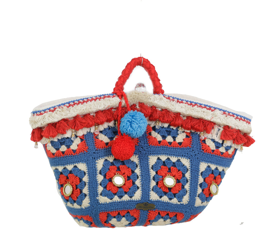 Sicilian coffa in woven dwarf palm, covered on the front with a checked crochet embroidery in red, ivory and blue wool, while the back is covered in solid red fabric. The upper part is totally adorned with six trimmings meticulously matched in color and shape. Brass pendants and mirrors give it shine and harmony. The handle is covered with red braided wool trimmings, where two wool pom poms are tied on one side which make it cheerful and Sicilian. Crystal effect button closure. Every detail is carefully studied.