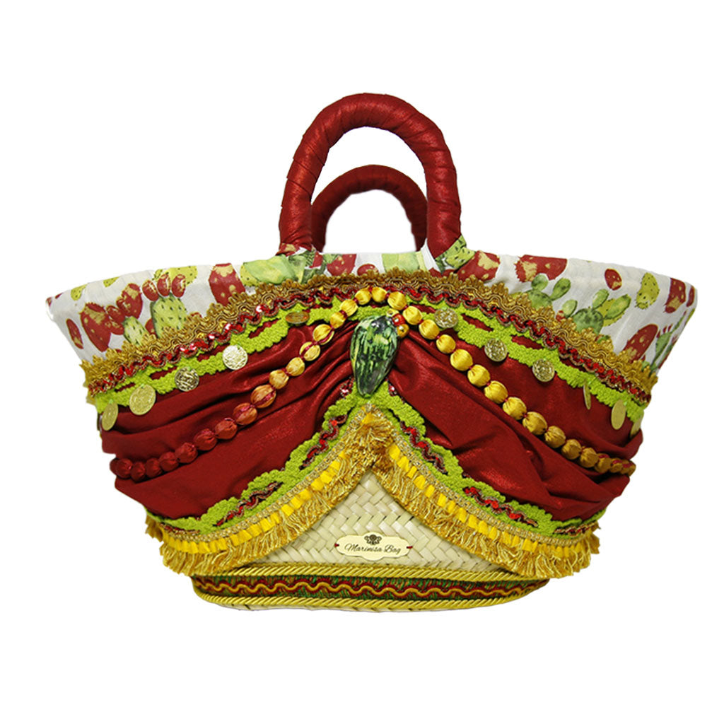 Coffa in palma nana intrecciata. La parte frontale e posteriore sono rivestite con medesimi tessuti e passamanerie in cotone e in strass. Una collana di raso adorna tutto il contorno della coffa. Nella parte frontale risalta un fico d'India in ceramica circondato da monete in metallo dorato. Manico completamente rivestito. Nella parte interna chiusura con cerniera, comprende una tasca e un borsello abbinato.