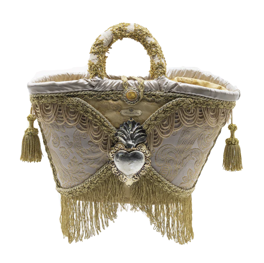 Coffa in palma nana intrecciata completamente rivestita .La parte frontale è adornata da un decoro di passamanerie dalle tonalità oro ,che incorniciano due tessuti damascati differenti , accentuandone la particolarità. Al centro un grande cuore in metallo oro e argento antico , ne accresce la bellezza. La sicilianità viene maggiormente evidenziata da due nappine poste ai lati . La parte posteriore è rivestita da un tessuto a righe dagli stessi toni. Il manico ha una doppia rifinitura . Il suo interno è rivestito da un tessuto oro e contiene una tasca interna decorata . Il tutto chiuso da una sacca e da un bottone. Pochette abbinata compresa da poter utilizzare anche singolarmente.